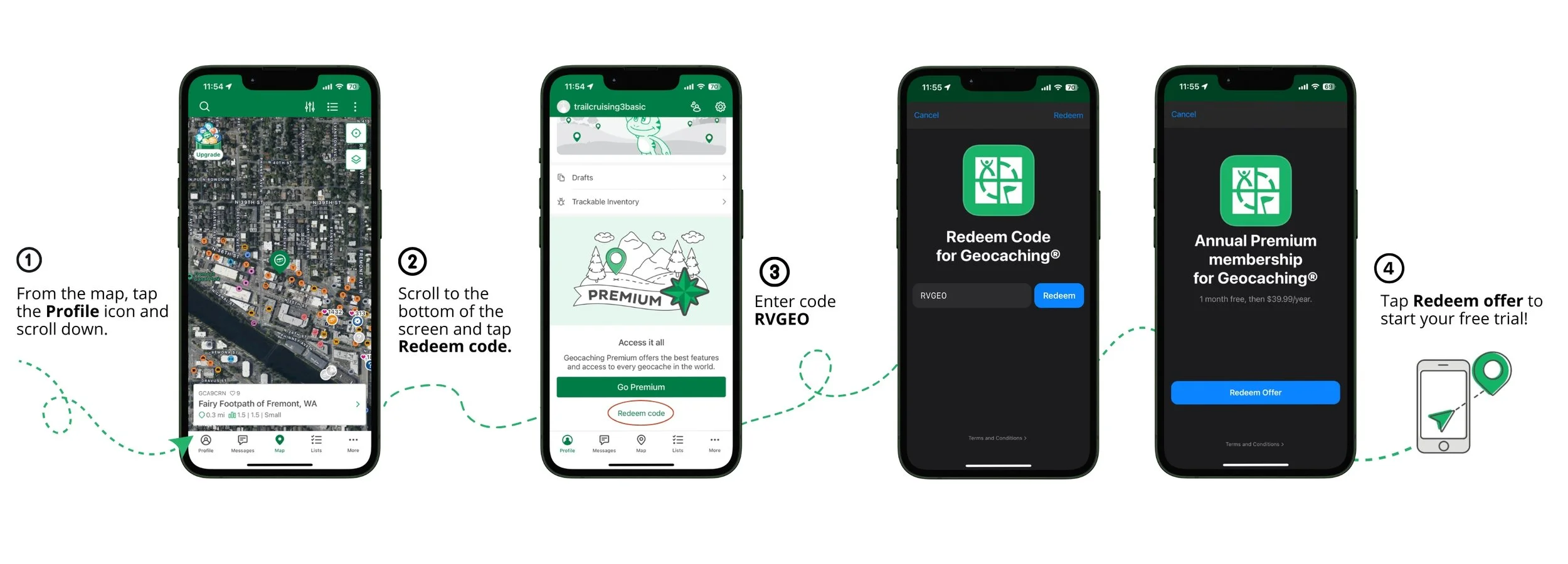 To redeem on web, visit payments.geocaching.com, select the annual option, and enter code RVGEO to start your free 30-day trial of Premium membership.